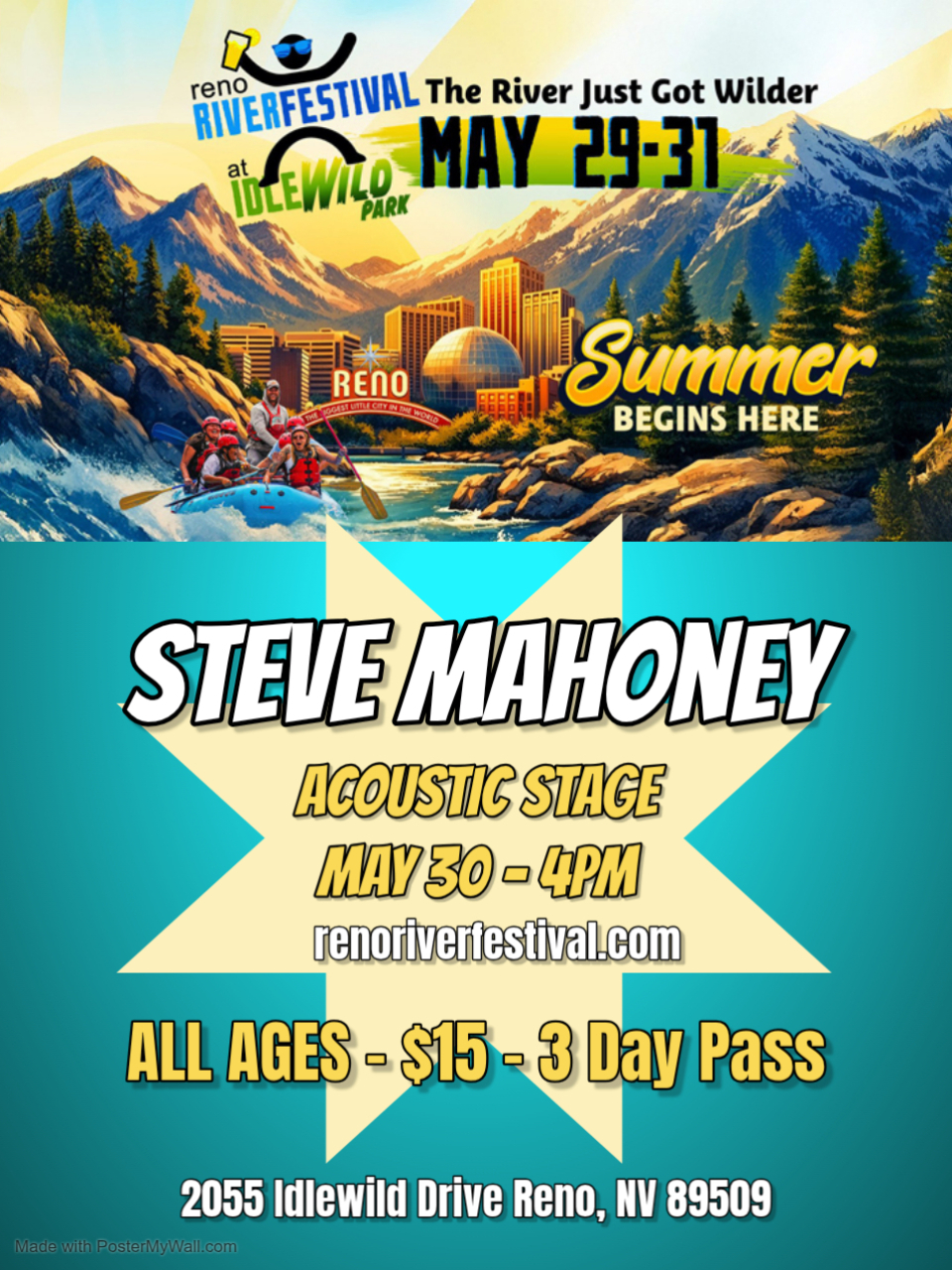 Award winning singer / songwriter Steve Mahoney bring his high energy acoustic set to the Reno River Festival.