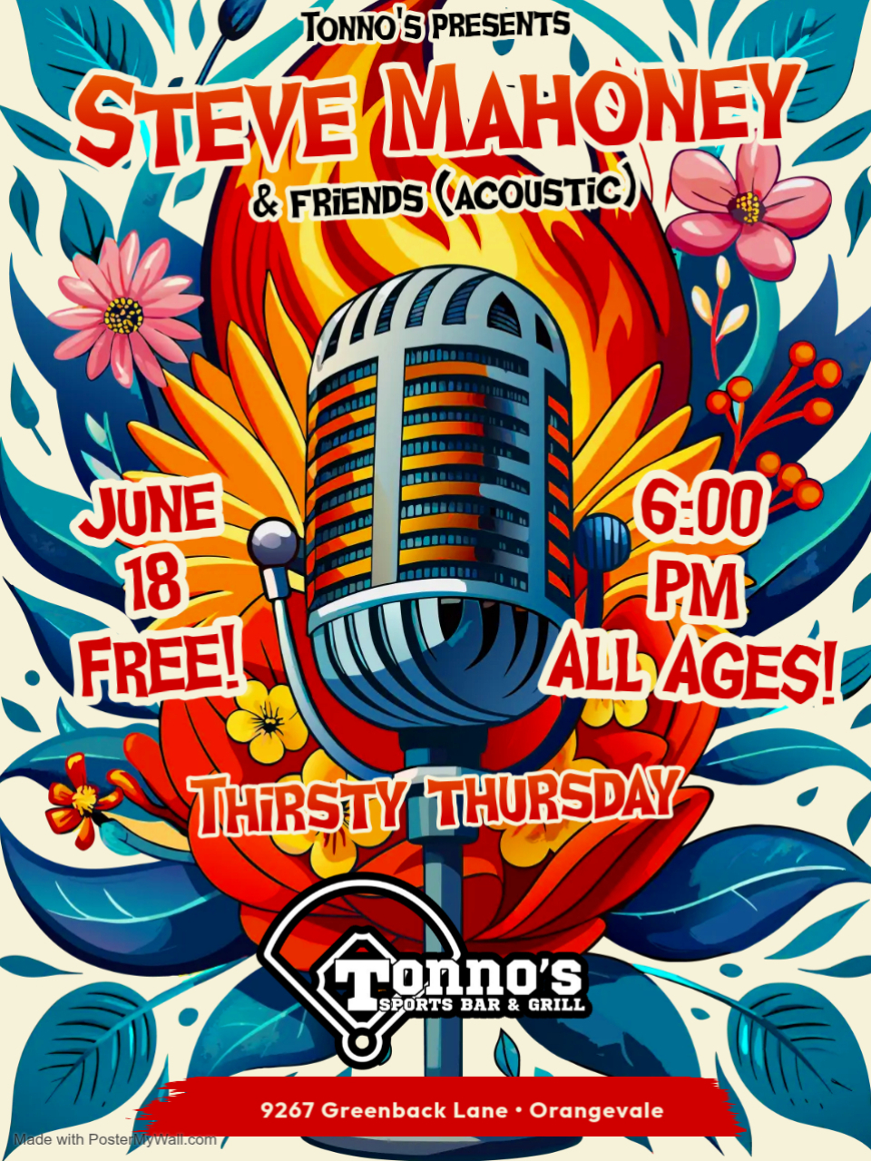 Award winning singer / songwriter Steve Mahoney & Friends bring their high energy set to Tonno's for an ALL AGES fun and family friendly event.