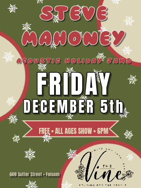 Award winning singer / songwriter Steve Mahoney brings his high energy fun holiday set to The Vine in Folsom for an ALL AGES fun and family friendly event.